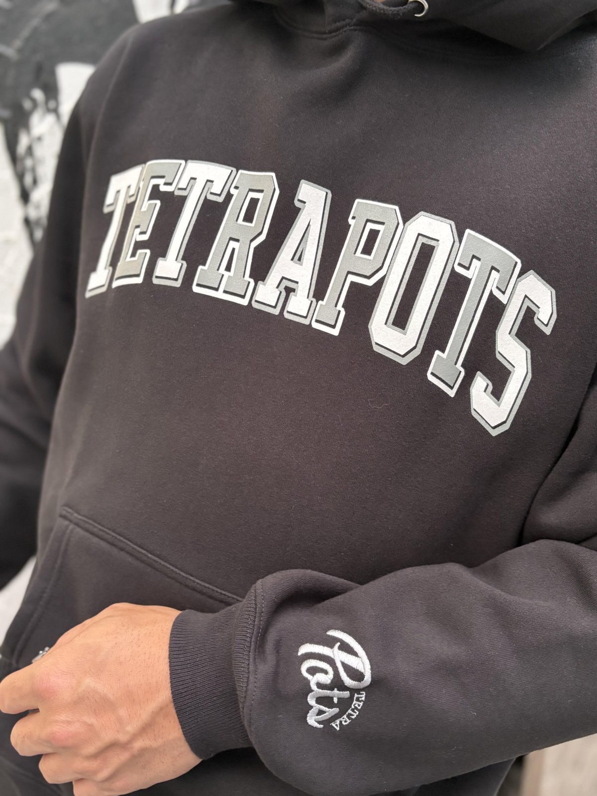 プリント位置を計算しつくしたカンガルーポケットや丈夫でボリューム感のあるフード二重仕様など、Tetrapotsクオリティが随所にちりばめられている1枚。